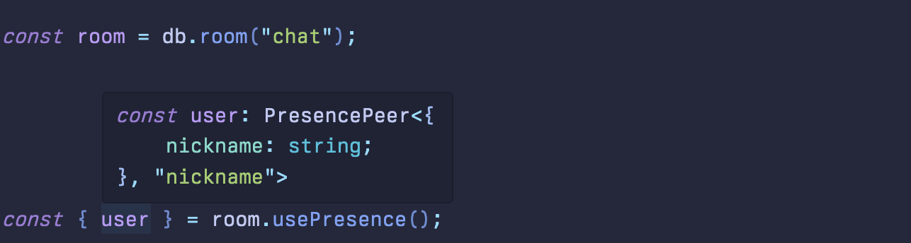 // `db.room()` to share presence and topics to an Instant generated default room
